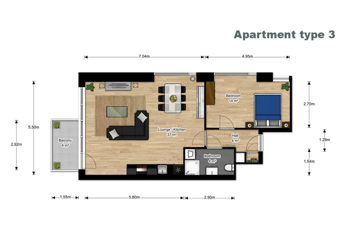 The type A3 apartment is a one-bedroom apartment including a balcony facing the Kaappark side. The kitchen includes a dishwasher. Further the kitchen is equipped with a ceramic cooker, fridge freezer combination and a combi microwave.