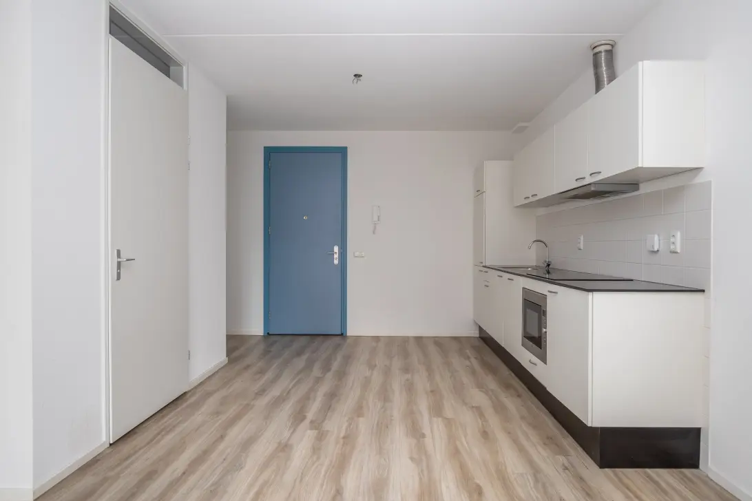 The type S7 studio is a studio facing the Kaappark side. The kitchen includes a dishwasher. Further the kitchen is equipped with a ceramic cooker, fridge freezer combination and a combi microwave.