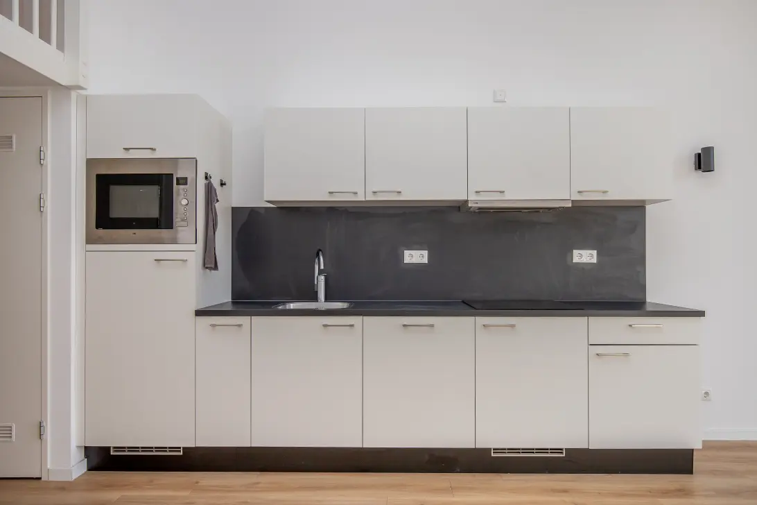 The Type B1 Maisonnette is a split level apartment with entresol in a monumental building. The apartment has a street side view. This spacious apartment features one bedroom on the entresol, a spacious living room and a bathroom with walk-in shower. The kitchen includes a combi oven/microwave, fridge freezer combination, dishwasher and induction cooker. The apartment also has a separate room with a washing machine connection.