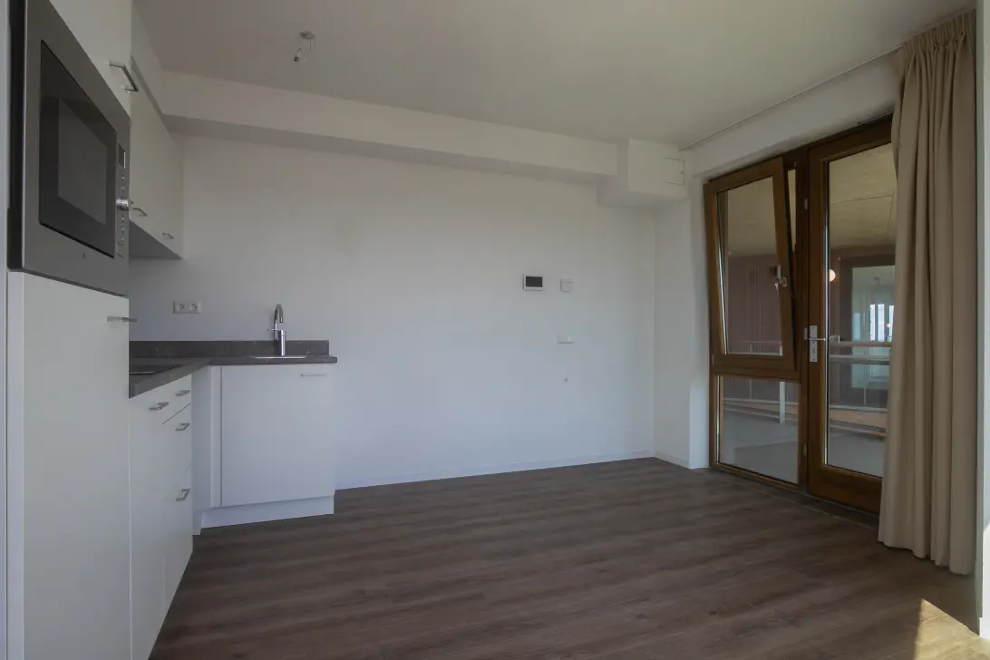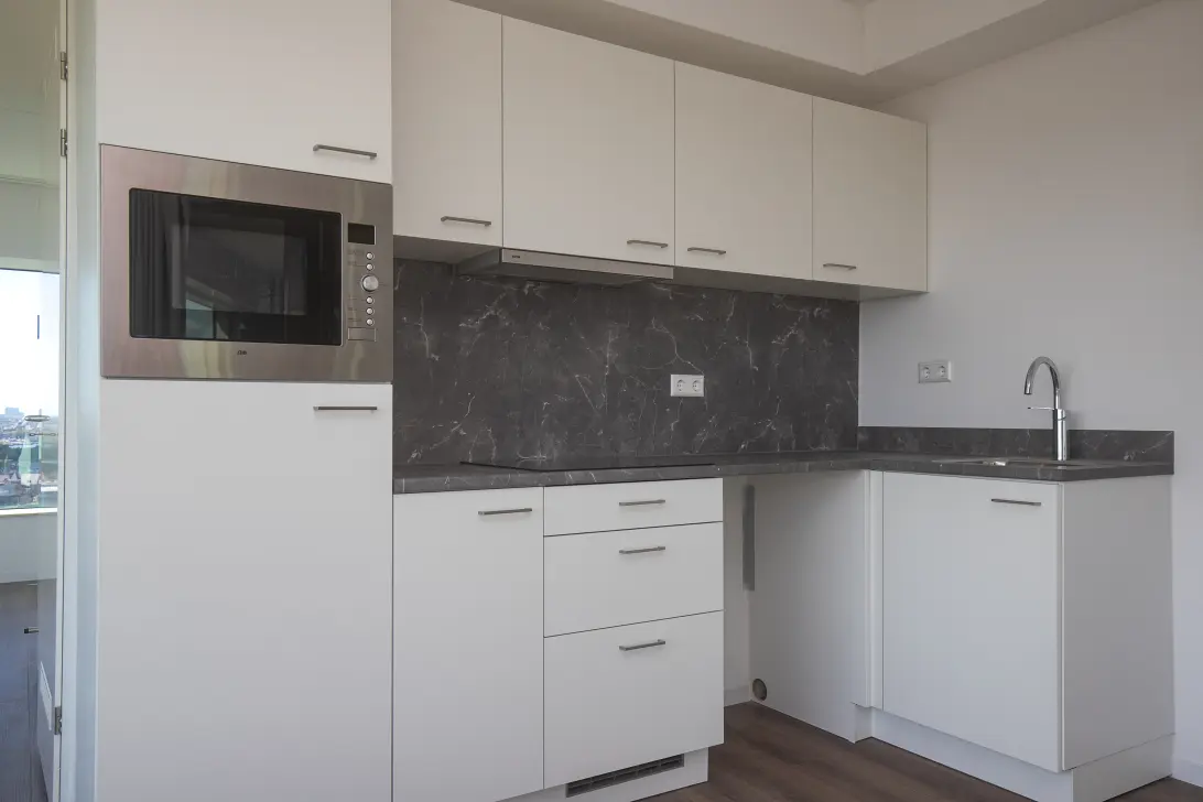 Type B-Ks is a 40m2 studio located on floor 11 facing the south west side and located at the railway side*. The apartment comes with a well-equipped kitchen with an induction hob, fridge-freezer, combi oven, and a connection to install a washing machine or dishwasher. In addition, the property is unfurnished with high-quality PVC flooring and curtains.